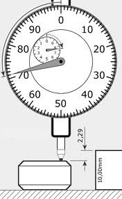 Suponhamos uma medida de -2, 29 mm (menos dois milímetros e vinte e nove centésimos) sobre uma base que tem medidas de 10,00 mm (dez milímetros) e uma segunda base menor 2,29 mm.Veja na figura abaixo um exemplo: