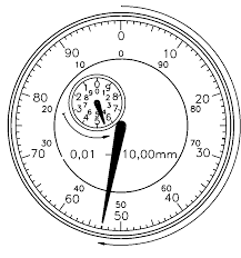 Exemplo: Se o ponteiro principal (grande) movimentar-se de 0 a 10 no sentido horário, temos 0,10 mm (dez centésimos de milímetros), de 0 a 50, temos 0,50 mm (cinquenta centésimos de milímetros) de 0 (zero) a 0 (zero), temos 1,00 mm (um milímetro, volta completa) e assim sucessivamente. Este ponteiro maior do relógio comparador conta cada traço em 0,01 mm (um centésimo de milímetros).